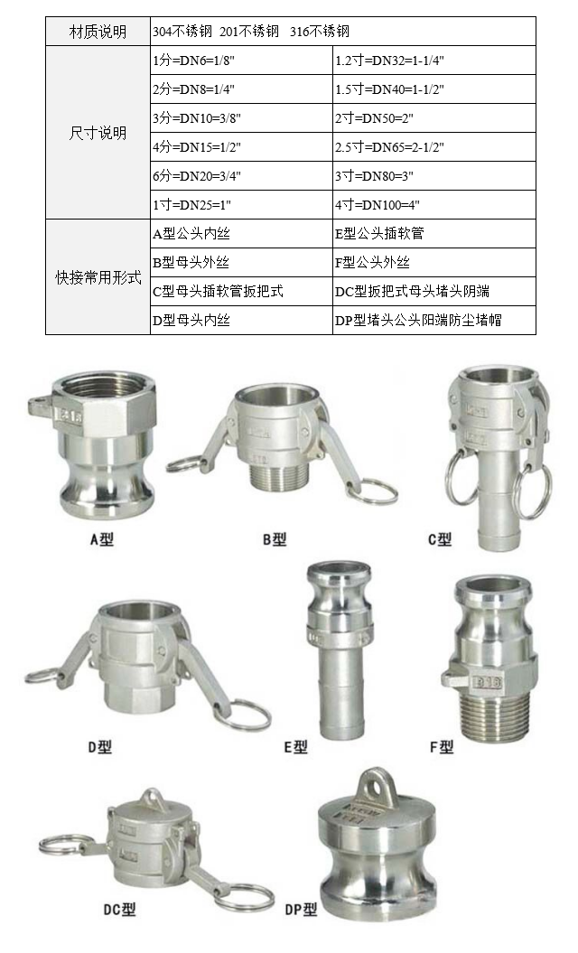 扳把式快速接頭按型號分為:KJT-A型B型C型D型E型F型DC型DP型及非標型9個型號,其中有A型、E型、F型、DP型4個公頭和B型、C型、D型、DC型4個母頭。